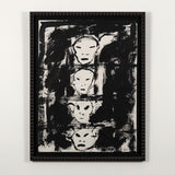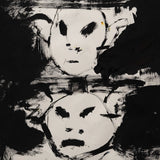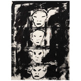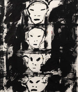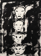 Throughout the artist's oeuvre, he explores a consistent tension between cartoon-like naiveté and blunt anarchism. His raw, visceral aesthetic often features characters that resemble either bunny-men or angels. This is a classic example as the figure's image is neatly stacked, similar to a film-strip, yet changing or morphing from frame to frame.