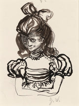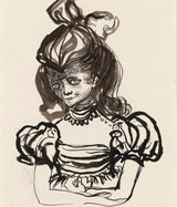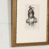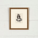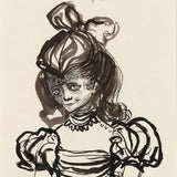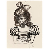 This drawing features a young girl posed in fancy clothes evocative of the Victorian era with an expression of sadness on her face. Her dark hair and the shadow from the hat above her slightly down-turned face intensify the dark cloud surrounding this subject.