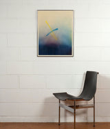 This work, "Colour Check" is an enamel painting on paper showcasing Lochhead's signature abstract aesthetic. Slightly off-centre, a turquoise slash of color intersects with an elongated check-mark shape in lemon yellow. These vibrant colors stand out from the misty background which gradually fades from dark shades of blue and purple into vanilla.