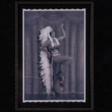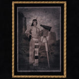 These studio portraits were captured, produced, and framed to emulate antique daguerrotypes. They depict Monkman’s alter ego—Miss Chief Eagle Testickle—in a variety of performative roles across time. As a whole, the series references the history of Aboriginal performances for a Western audience.