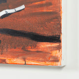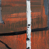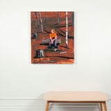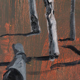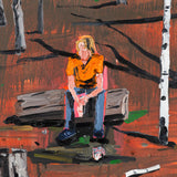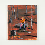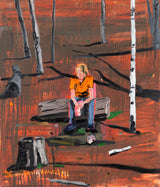 "New Father" is part of Dorland's series "Red Deer, Alberta", which recalls memories from the artist's childhood in the Prairies. In this work, a lone figure sits atop a log amidst bare birch trees in an otherwise desolate landscape. The forest floor is illuminated by an intense neon orange underpainting that infuses the scene with a supernatural glow. Tree shadows are cast in contradicting directions, raising questions about the obscure location.