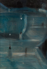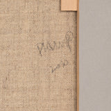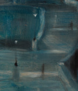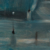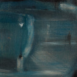 While the location is normally bustling with tourists and locals and is flanked by a number of luxury boutiques, in Paul P.'s depiction the atmosphere is quiet and calm. The artist suggests a soft fog that dissolves the architecture into an impressionist blur. A series of lamp posts punctuate the canvas, emerging as one of the few motifs to come into focus. Two phantom-like male figures are in eyesight of eachother. Are these two nocturnal pedestrians or is the artist portraying something more erotic or dangerous?