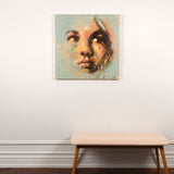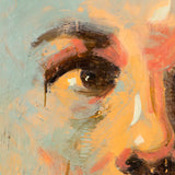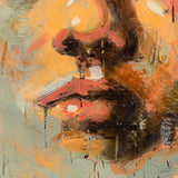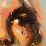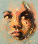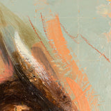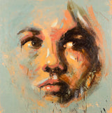 While Scherman's palette is frequently moody, featuring dark backgrounds reminiscent of chiaroscuro, here his palette is soft and sumptuous. The result is an ethereal, light-bathed composition. The intricate layers, varying opacity, and remarkably rich texture contribute to a sumptuously elegant portrait. Yet despite these gentler hues there is something unsettled or suspicious in this young woman's regard.