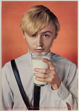 The image features Billy, a young blond man depicted against an orange background. This idealized Aryan boy raises a large glass of milk to his lips, which already has a Hitler-like milk moustache. He looks suggestively at the viewer, exuding several conflicting messages – do consumer products seduce the masses and convince them to consume political ideologies?