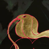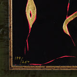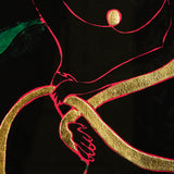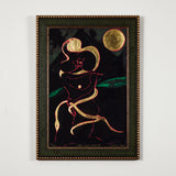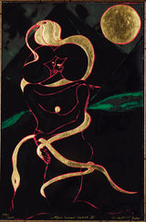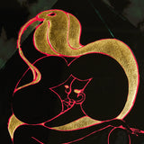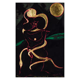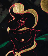 In this work, two immeshed figures engage in a passionate embrace under the glow of a metallic moon that simultaneously reveals the contours of an expansive pyramid in the background of the composition. The couple is affixed by the grip of a golden cobra that coils around their bodies, a biblical reference that symbolizes both temptation and sensuality.