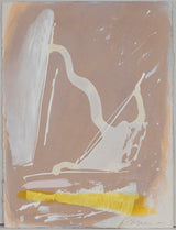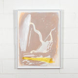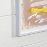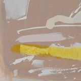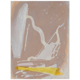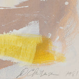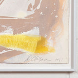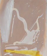 The aesthetic complexity he achieved with these combined techniques are perfectly demonstrated in this work. Splatters and spontaneously created forms of icing white hover above a whirlwind of a background. On the bottom edge, a bright streak of canary yellow overlays the other colours underneath, adding a unique depth to this work.
