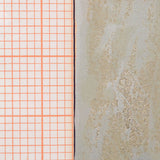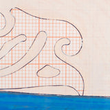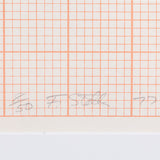 The work features a pair of French curves, which flourish in the center of the page atop a delicate sage green border. A vibrant orange grid sits on the perimeter of the image, a recurring motif that is synonymous with Stella's mechanical aesthetic.