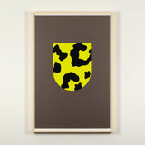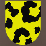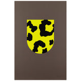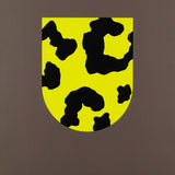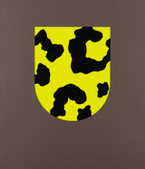 "Dr. Brute Shield" offers a fluorescent yellow and black leopard-patterned crest on a hand-painted backdrop. This iconic pattern is borrowed from the group's colleague and frequent collaborator, Eric Metcalfe, whose alter-ego "Mr. Brute" was synonymous with the same daring motif.