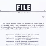 The piece was produced as a mailer in the form of a press release for General Idea's FILE Megazine, an appropriation of LIFE Magazine. "Orgasm Renewal Project" was part of a larger 1970-71 project titled "Orgasm Energy Chart", which invited participants to partake in recording their actions as well. This work was reissued in 1995 and hand-signed by AA Bronson.