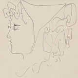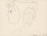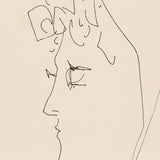 This intimate line drawing features a woman's angular profile, her boxy curls flowing out from the confines of her head scarf. The woman's strong gaze peers off into the distance, lost in the mundanity of her commute.