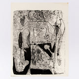 Harold Town began to explore printmaking because of his friend and fellow artist Oscar Cahen. This work is quite rare and unusual as it is black and white, with a total absence of color.