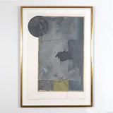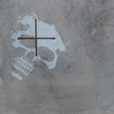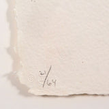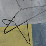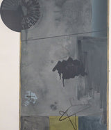In this lithograph on Angoumois paper, a minimal color field made of shades of grey and green is interrupted by several recognizable forms. The scattered imagery floats across the composition, offering a discrete glimpse of a clothes-hanger, a wheel, and a skull.