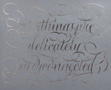 Holzer's text-based pieces have typically provoked the public to consider the power structures that surround us. In this work, Holzer lends one of her Truisms "All Things are Delicately Interconnected," in support of the 50th anniversary of Earth Day. The phrase is rendered in a luminous silver leaf against a nearly monochromatic elephant gray backdrop. Executed in elegant calligraphy, the text delicately ribbons across the surface of the work, curling and looping as each letter intertwines with the next.
