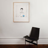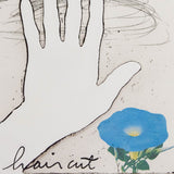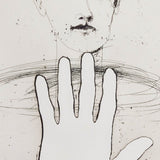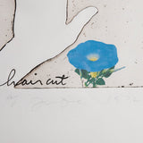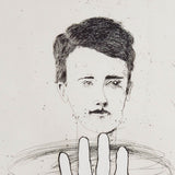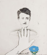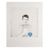 "Blue Haircut" captures Rimbaud with a distant, almost vacant expression, his portrait floating in a void of negative space that amplifies a sense of isolation. A spectral hand extends from the seam of the composition, reaching toward the poet's face.