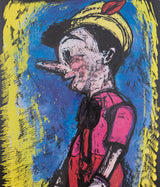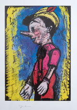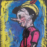 This screenprint is exemplary of Dine’s depiction of Pinnochio over the years. Bold primary colors are contained by strong contour lines, highlighting Dine’s innate ability to create texture and impact within printmaking. Pinnochio faces away from the viewer, showcasing his profile (and elongated nose) that suggests he might have been caught in a mischievous act.