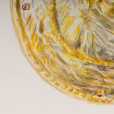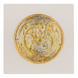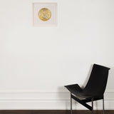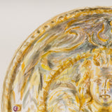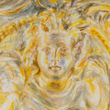 "Gold Medallion" depicts a textured object centring a figure from antiquity. Four red stones adorn the medallion, highlighting its ornate decoration. This work is particularly intriguing as there is a palpable tension between the verisimilitude of the object and the layered, almost translucent softness with which it's rendered. Like the best of her work, the medallion is realized in her signature version of soft realism.