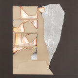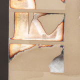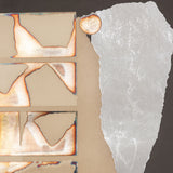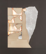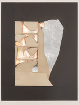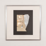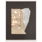 “Graphic Presence” is a paradigm of Nevelson’s printmaking from this period, featuring her signature layered approach of neutral, monochromatic, and iridescent hues. While shiny, reflective, and textured, this print still manages to make use of Nevelson’s signature color, black, which is accentuated by metallic sheets and newsprint clips.