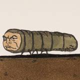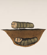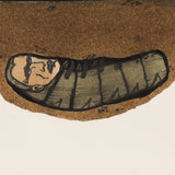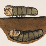 Featuring a stand-off, this image is packed with tense resolve. A stern-looking, eye-patch-wearing critter stands atop a solemnly interred bug. The latter lies belly up, sporting a stony expression and narrowed eyes. Is the round-faced bug dancing on a grave? Is he even aware of the other bug's whereabouts? While this sense of curious incompleteness might feel limiting, it is in fact one of the charms of Dzama's work. Â