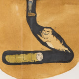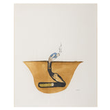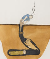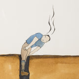 As with most of Dzama's work, this image presents viewers with visual information but no clear explanation of what is occurring. A golden cross-section of earth anchors the composition, with a burrowed tunnel at its core. At the bottom of the tunnel lies an anthropomorphized caterpillar, its long, green body topped with a human face. In front of the critter leaps a cat-like animal, striped and smiling sinisterly. Stuck in the tunnel from the knees down, there is a man. He bends over slightly as fumes emanate from his head.