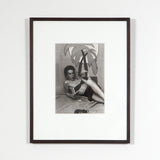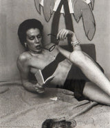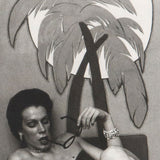 In this black and white photograph, Goldin captures her subject sprawled across a beach-like backdrop. While Goldin's later images are frequently melancholy or dreamy, here there is a surprising playfulness approaching satire. Shoes are strewn about as if to mimic the casual nature of an actual beach, while her subject relaxes under a cartoon-like palm tree affixed to the wall.