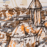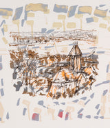 "Midi à Vétheuil" features Église Notre-Dame de Vétheuil, a gothic cathedral that dates back to the 13th century. Though representational, Riopelle's depiction is still indicative of his spontaneous aesthetic, including energetic ringlets that surround the structure.