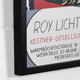 Lichtenstein cleverly incorporates his name and the exhibitions details in a separate speech bubble appearing to emerge from the image of Vicki and the mysterious man.