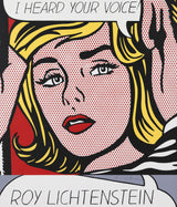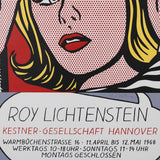 This poster was created to promote Roy Lichtenstein's exhibition at Kesterner- Gesselschaft in Hannover in 1968. The image is a paradigm example of Lichtenstein at his best and most recognizable - Ben-Day dots, a beautiful blonde, and a speech bubble implying ambiguous melodrama beneath.