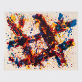 With an explosive energy, this screenprint represents Francis' signature style. Featuring a combination of splatters and bimorphic forms executed in primary colours, the composition vibrates with verve. The primary blues, reds, and yellows are applied with slight transparency, emitting new hues as they mingle and overlap. The white space is activated by splatters from the central, cross-hatched lines. Francis' title gives us a hint as to where his mind was when creating the composition--and it's not difficult to see logs stacked; with nascent flames gathering around them.