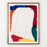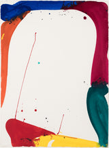 This work exemplifies Francis' vibrant aesthetic with colour creating a ring around the edge of the heavy-stock paper. The vaguely biomorphic forms are executed in saturated primary colours, with the central section of the page left almost entirely exposed. His experimentation with the empty-center method was consistent until around 1970, when he opted for less prominent blank spaces peeking through his colourful tangles.