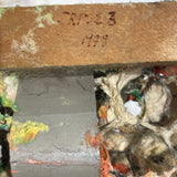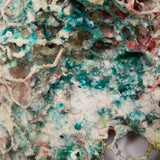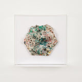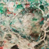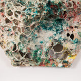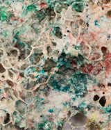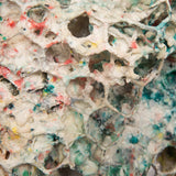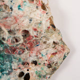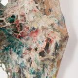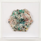 In this unique work, arguably considered as a relief sculpture, Gilliam begins with hexagon shaped-base. It is given volume and presence from hardware cloth, which is made of flexible but powerful galvanized steel wire twisted into linking hexagonal forms. The structure is covered in an enchanting richly colored paste of white, teal, clover green, rose, lemon, marigold that recalls icing or a confetti cake.