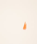"Provincetown Red Sails" is an early paradigm of Katz's pared-back aesthetic. A bold vermilion sailboat stands alone against a muted blush backdrop, highlighting the expansive seascape with minimal detail.