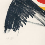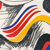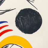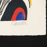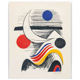 Similarly, Calder's works on paper, share many of the same visual characteristics that his sculptures are known for. Calder was a prolific and active print maker with an unmissable palette; bold modernist shapes rendered in saturated primary colors. His compositions were playful flat geometric compositions occasionally flirting with figuration.Â