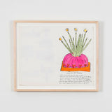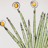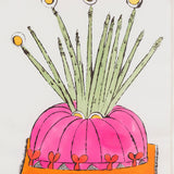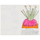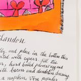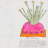 This spread features a bright pink jelly bursting with a decoration of asparagus spears and eggs paired with cheeky recipe instructions. The lithograph print is accented by vibrant washes of fuschia, orange, and green pigment that animate Warhol’s signature linework.
