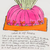 "Salade de alf Landon" is a delightful paradigm from this era. This whimsical lithograph is an output from Warhol's self-published cookbook, "Wild Raspberries", a collection of fanciful recipes and illustrations that satirize the extravagant gastronomy of the 1950s.Â