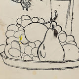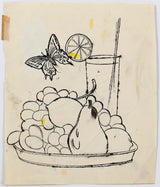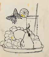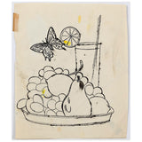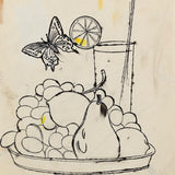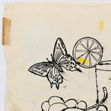 This untitled illustration is an intimate, behind-the-scenes look at Warhol's commercial practice and signature aesthetic of the era. Here, the artist renders a lighthearted summer scene featuring an abundant fruit platter, lemonade, and a fluttering butterfly.