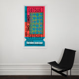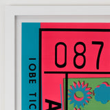 Presented as a vibrantly oversized ticket stub, the piece’s details are skillfully layered to create a buzzing composition. Â