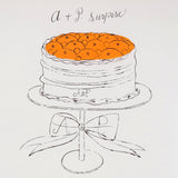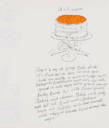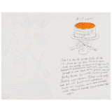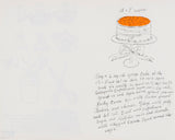 This spread features an abundant cake stand with a decorative red bow, paired with cheeky recipe instructions. The lithograph print is accented by a vibrant wash of orange pigment that animates Warhol’s signature linework.