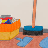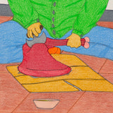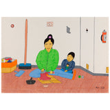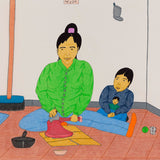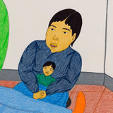 "Skinning" exemplifies Pootoogook's artistic vision and output. In this simplistic drawing, a mother and child are captured in a tender exchange as they prepare a meal. The pair sits on the floor while the mother butchers a piece of meat over a piece of cardboard. An ode to tradition, the woman uses an Inuit ulu, a traditional multi-purpose knife typically used by women.