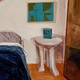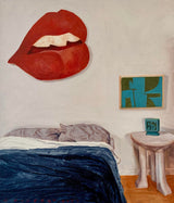 The work depicts a bedroom corner, including the top half of a rumpled bed, which is supervised by one of Tom Wesselmann's legendary shaped canvases. Rideout also decorates the room with one of John Dickinson's plaster tables and a mid-century painting that could be an early Leon Polk Smith.