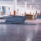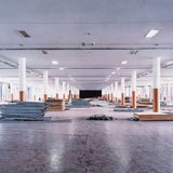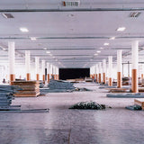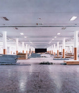 The architectural elements of this grand industrial space fill the frame but among them are also traces of things left behind (hanging work jackets and discarded construction materials) representing its function and public use.