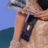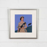 This work, created in 1973 (the era of the Pachter's most "notorious" image) is an exceptionally rare painted collage. The source image of the Queen is a well known and highly circulated photo. Pachter, painted the background with one of his stylized Moose, quietly climbing up a cliff in the background.