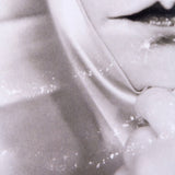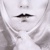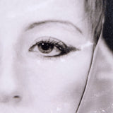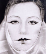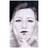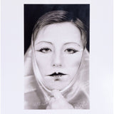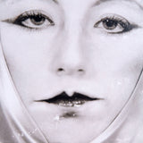 Close-cropped and black and white, Sherman highlights the artists’ signature French mime makeup and confrontational gaze. She holds a piece of silk fabric tightly bound at her chin.Â