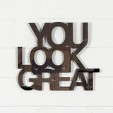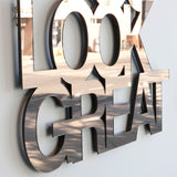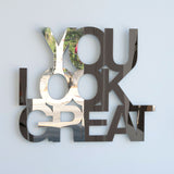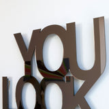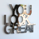 Besides the fact that the sculpture is sexy and chic, any opportunity to feel self-critical (confronted with ones' reflection) is bumped by the self-affirming slogan.