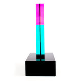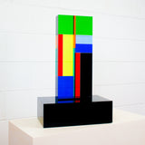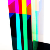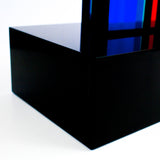 In a brightly lit room, the sculpture creates a colorful phantom shadow on the wall evocative of stained glass illuminating a church wall.