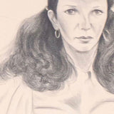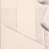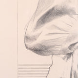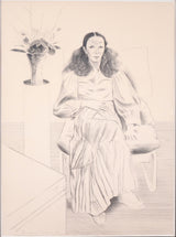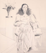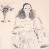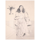This striking and elegant lithograph is a remarkable example of Hockney’s technical skills as a draftsman. The image is highly detailed and nuanced as he uses several techniques in shading and crosshatching. He expertly shows the delicate wisps of her hair, billowing fabric of her dress and dimension of the room where she sits.