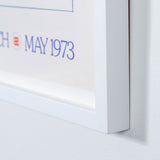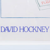 This 1973 exhibition poster is an example of his talent as both an illustrator and a graphic artist. It features an elegant image of a glass vase holding six blue iris stems titled “Still Life With Book”. It’s minimal beauty and striking colour palette makes this an excellent poster image to represent Hockney’s signature style.