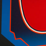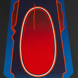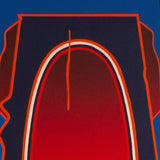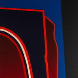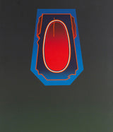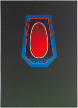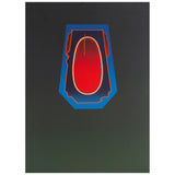 This lithograph encapsulates Remington's practice, containing many of her visual signatures. Like the best of her works, this lithograph features a dark background with an abstract shape containing near-bilateral symmetry in the centre. At the heart of the shape is a glowing red oval, one of Remington's most frequently employed shapes. The vibrant oval is ensconced within, or framed by, flaming orange outlines and a blue hard-edge shapes.