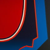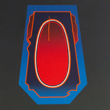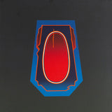 Remington often created dark green backgrounds with abstracted shapes completed in vibrant hues of red, blue, and orange. The fields of color are expertly executed gradients, another trademark of Remington's. The dark background graduates vertically from charcoal to forest green; while the oval shifts in tone from dark garnet into flaming ruby. Ensconcing the oval are the blue shapes which mirror the same tonal shift, but instead shift from cobalt into bright sapphire.