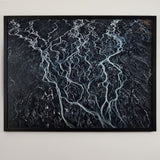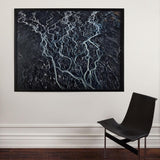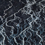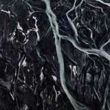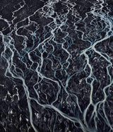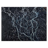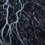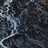 This stunning large-scale image masterfully captures the complex, fractal-like branching of the braided glacial river, viewed from an aerial vantage point. The striking interplay between the inky black volcanic soil and the illuminated river presents a powerful and dramatic contrast between the elements, emphasizing the raw beauty and grandeur of this natural landscape. This is Burtynsky at his best; celebrating the abstract elements while educating his viewers on how natural resources and used by mankind.