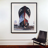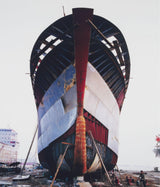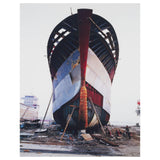 This is a striking image that offers an intersection of two of Burtynsky's most acclaimed motifs; Chinese industrialization and Ship-breaking. In this photograph, the viewer confronts the hull of an ocean-liner either in the process of repair or total disassembly. Burtynsky's curious perspective turns this massive sea vessel into a nearly abstract color-blocked composition that is part Lee Bontecou part Piet Mondrian...all Burtynsky.